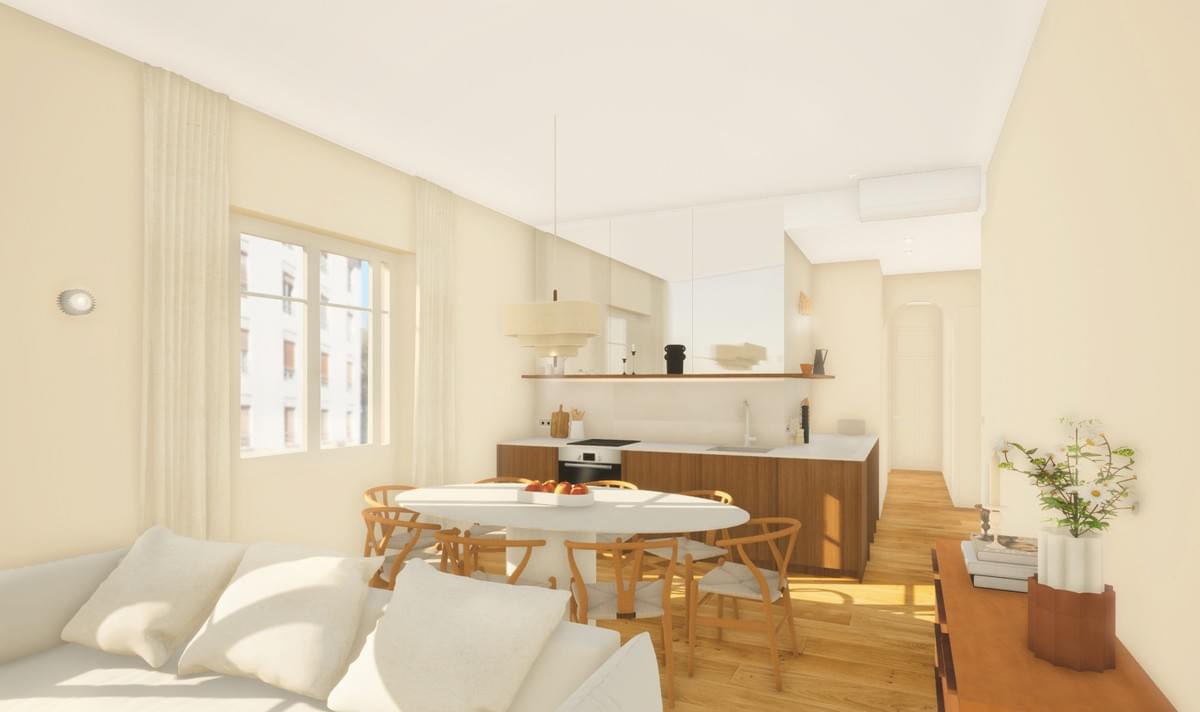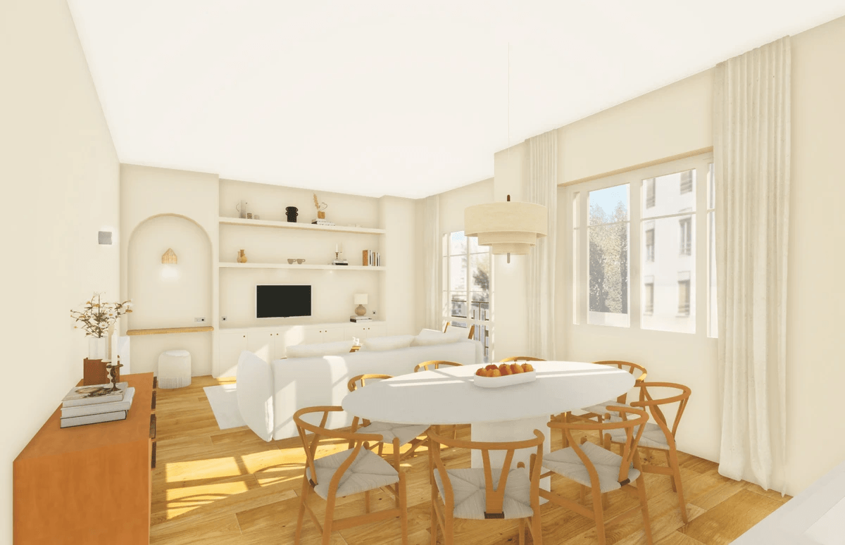 " Pour cet appartement, nous avons voulu décloisonner les espaces pour avoir une belle pièce de vie ! La monochromie d’un blanc beige lumineux allié au noyer et à l’inox donne à l’appartement ce style intemporel que nous aimons tant "