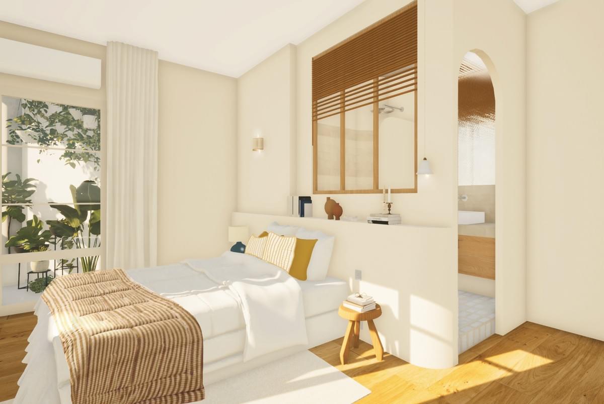 Au fond la suite parentale de 16 m² s’ouvre sur un balcon. Une verrière en bois avec stores vénitiens intégrés laisse passer la lumière de la salle d’eau attenante. La tête de lit et les placards aménagés créent une atmosphère douce et enveloppante.