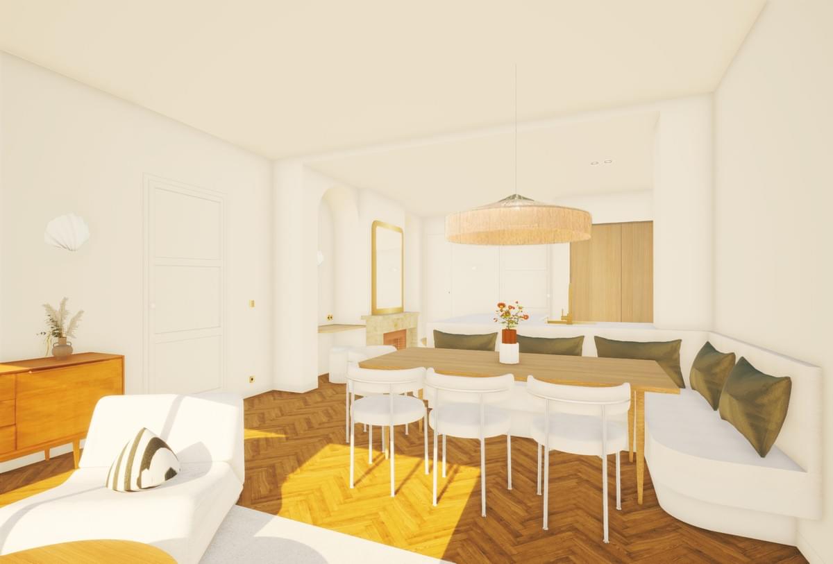 " Nous avons choisi de mettre en valeur les fondamentaux de cet appartement avec son beau parquet d'origine, sa cheminée et sa terrasse côté ouest donnant sur un espace de verdure très au calme. Arches, lignes courbes, arrondis sont autant de détails architecturaux qui confèrent une grande douceur à cet appartement traversant. "